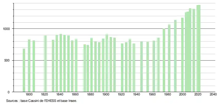 L'évolution du nombre d'habitants est connue à travers les recensements de la population effectués dans la commune depuis 1793. Pour les communes de moins de 10 000 habitants, une enquête de recensement portant sur toute la population est réalisée tous les cinq ans, les populations légales des années intermédiaires étant quant à elles estimées par interpolation ou extrapolation[17]. Pour la commune, le premier recensement exhaustif entrant dans le cadre du nouveau dispositif a été réalisé en 2004[18].