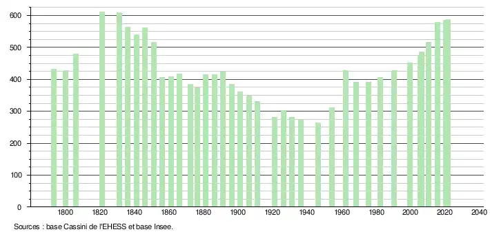 L'évolution du nombre d'habitants est connue à travers les recensements de la population effectués dans la commune depuis 1793. Pour les communes de moins de 10 000 habitants, une enquête de recensement portant sur toute la population est réalisée tous les cinq ans, les populations légales des années intermédiaires étant quant à elles estimées par interpolation ou extrapolation[18]. Pour la commune, le premier recensement exhaustif entrant dans le cadre du nouveau dispositif a été réalisé en 2005[19].