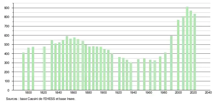 L'évolution du nombre d'habitants est connue à travers les recensements de la population effectués dans la commune depuis 1793. Pour les communes de moins de 10 000 habitants, une enquête de recensement portant sur toute la population est réalisée tous les cinq ans, les populations légales des années intermédiaires étant quant à elles estimées par interpolation ou extrapolation[19]. Pour la commune, le premier recensement exhaustif entrant dans le cadre du nouveau dispositif a été réalisé en 2006[20].