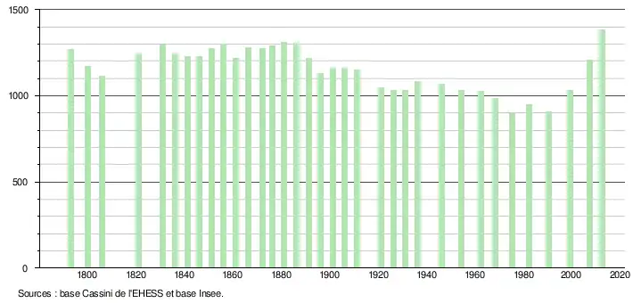 L'évolution du nombre d'habitants est connue à travers les recensements de la population effectués dans la commune depuis 1793. À partir du , les populations légales des communes sont publiées annuellement dans le cadre d'un recensement qui repose désormais sur une collecte d'information annuelle, concernant successivement tous les territoires communaux au cours d'une période de cinq ans. Pour les communes de moins de 10 000 habitants, une enquête de recensement portant sur toute la population est réalisée tous les cinq ans, les populations légales des années intermédiaires étant quant à elles estimées par interpolation ou extrapolation[26]. Pour la commune, le premier recensement exhaustif entrant dans le cadre du nouveau dispositif a été réalisé en 2007[27],[Note 1].