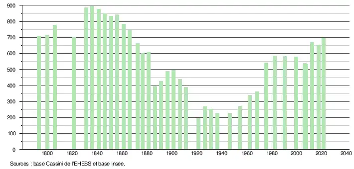 L'évolution du nombre d'habitants est connue à travers les recensements de la population effectués dans la commune depuis 1793. Pour les communes de moins de 10 000 habitants, une enquête de recensement portant sur toute la population est réalisée tous les cinq ans, les populations légales des années intermédiaires étant quant à elles estimées par interpolation ou extrapolation[38]. Pour la commune, le premier recensement exhaustif entrant dans le cadre du nouveau dispositif a été réalisé en 2007[39].