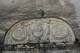 Blason | Parti : au 1er de gueules au léopard lionné d'or, au 2e coupé au I d 'argent à la branche de hêtre feuillée et fleurie au naturel et au II d'azur au roc d'échiquier d'or[53]. |