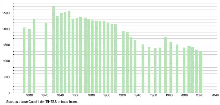 L'évolution du nombre d'habitants est connue à travers les recensements de la population effectués dans la commune depuis 1793. Pour les communes de moins de 10 000 habitants, une enquête de recensement portant sur toute la population est réalisée tous les cinq ans, les populations légales des années intermédiaires étant quant à elles estimées par interpolation ou extrapolation[14]. Pour la commune, le premier recensement exhaustif entrant dans le cadre du nouveau dispositif a été réalisé en 2005[15].