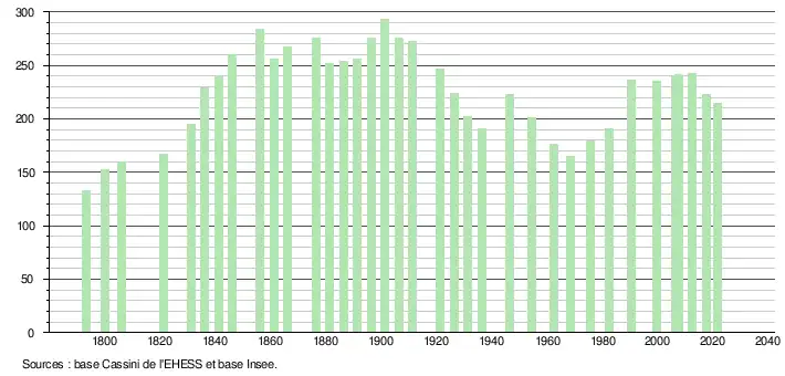 L'évolution du nombre d'habitants est connue à travers les recensements de la population effectués dans la commune depuis 1793. Pour les communes de moins de 10 000 habitants, une enquête de recensement portant sur toute la population est réalisée tous les cinq ans, les populations légales des années intermédiaires étant quant à elles estimées par interpolation ou extrapolation[19]. Pour la commune, le premier recensement exhaustif entrant dans le cadre du nouveau dispositif a été réalisé en 2007[20].
