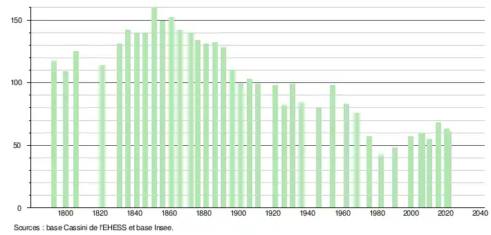 L'évolution du nombre d'habitants est connue à travers les recensements de la population effectués dans la commune depuis 1793. Pour les communes de moins de 10 000 habitants, une enquête de recensement portant sur toute la population est réalisée tous les cinq ans, les populations légales des années intermédiaires étant quant à elles estimées par interpolation ou extrapolation[26]. Pour la commune, le premier recensement exhaustif entrant dans le cadre du nouveau dispositif a été réalisé en 2005[27].