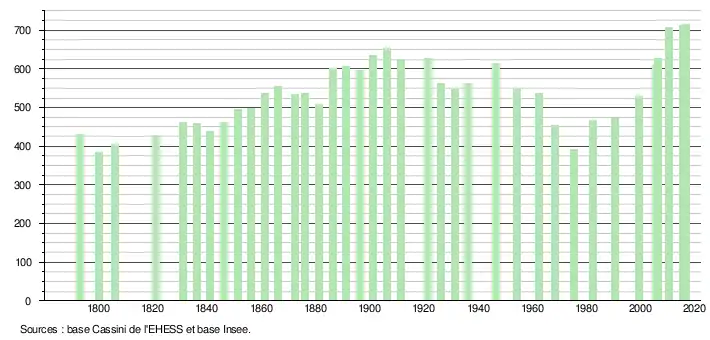 L'évolution du nombre d'habitants est connue à travers les recensements de la population effectués dans la commune depuis 1793. Pour les communes de moins de 10 000 habitants, une enquête de recensement portant sur toute la population est réalisée tous les cinq ans, les populations légales des années intermédiaires étant quant à elles estimées par interpolation ou extrapolation[5]. Pour la commune, le premier recensement exhaustif entrant dans le cadre du nouveau dispositif a été réalisé en 2005[6].