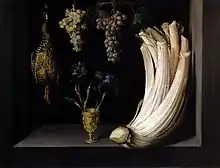 - Nature morte avec cardon, francolin, raisins et iris (1628), 71 x 92 cm, Musel del Prado, Madrid