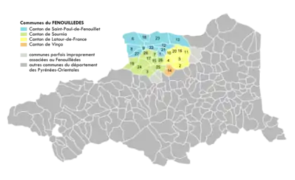 Ansignan1 - Bélesta2 - Campoussy3 - Caramany4 - Cassagnes5 - Caudiès-de-Fenouillèdes6 - Feilluns7 - Fenouillet8 - Fosse9 - Lansac10 - Latour-de-France11 - Lesquerde12 - Maury13 - Montalba-le-Château14 - Pézilla-de-Conflent15 - Planèzes16 - Prats-de-Sournia17 - Prugnanes18 - Rabouillet19 - Rasiguères20 - Saint-Arnac21 - Saint-Martin-de-Fenouillet22 - Saint-Paul-de-Fenouillet23 - Sournia24 - Trévillach25 - Trilla26 - Vira27 - Le Vivier28