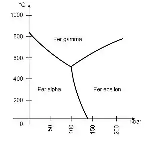 - dès les hautes températures à pression ambiante, à partir de 912 °C, le fer α devient un fer cubique à faces centrées (fer γ, structure appelée austénite dans l'acier), la transformation implique une variation d'énergie interne d'environ 0,22 kcal/atome-gramme à 1 184 K. Le fer γ est paramagnétique ;