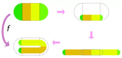 On définit f par composition, en appliquant d'abord une affinité orthogonale de rapport selon l'axe vertical aux points du carré, tandis que les demi-disques subissent une homothétie pour garder leur forme de disque. Il est important que le facteur a soit strictement inférieur à 1/2 pour assurer une marge entre les deux branches du fer à cheval dans la dernière étape. On applique ensuite au rectangle une affinité orthogonale dans l'autre direction, et de rapport , sans changer les demi-disques. Au terme de ces deux étapes l'aire du carré a été conservée, pas celle des demi-disques.