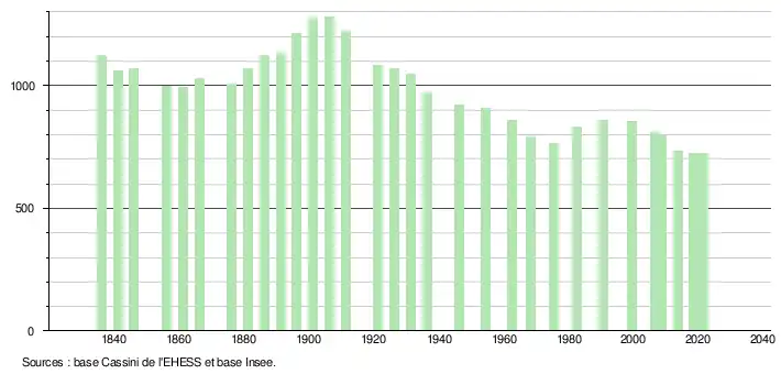 L'évolution du nombre d'habitants est connue à travers les recensements de la population effectués dans la commune depuis 1836. Pour les communes de moins de 10 000 habitants, une enquête de recensement portant sur toute la population est réalisée tous les cinq ans, les populations légales des années intermédiaires étant quant à elles estimées par interpolation ou extrapolation[25]. Pour la commune, le premier recensement exhaustif entrant dans le cadre du nouveau dispositif a été réalisé en 2008[26].