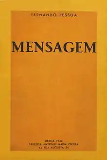 En 1934, il publie son premier recueil en portugais, Message. Ces quarante-cinq poèmes mystiques composent en trois parties une sorte d’épopée rosicrucienne[83] dont le messianisme sébastianiste prophétise une humanité nouvelle et l'avénement du « Cinquième Empire de paix universelle[83] ». Présentés par ses soins au jury du prix Antero de Quental (pt) fondé l'année précédente par l'ex-éditeur de la revue Orpheu, António Ferro (pt) devenu chef de la propagande de l'Estado Novo, ils lui valent de remporter le second prix, sa création étant jugée trop éparse pour un premier prix.