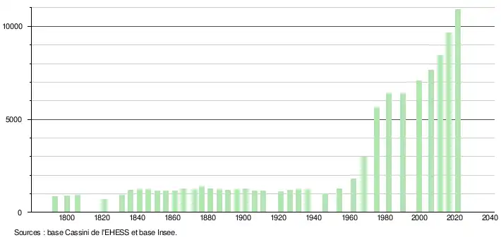 - Par convention dans Wikipédia, le principe a été retenu de n’afficher dans le tableau des recensements et le graphique, pour les populations légales postérieures à 1999, que les populations correspondant à une enquête exhaustive de recensement pour les communes de moins de 10 000 habitants, et que les populations des années 2006, 2011, 2016, etc. pour les communes de plus de 10 000 habitants, ainsi que la dernière population légale publiée par l’Insee pour l'ensemble des communes.