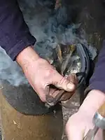 On dit qu'il « brûle » ou « porte à chaud ». Il prend bien soin de positionner le fer « dans le sens de la fourchette » c’est-à-dire dans l'axe du pied. Il doit alors rapidement analyser ce qu'il voit pour savoir si le fer repose bien uniformément sur le pied, et si sa tournure correspond bien au pied. Il observe aussi la position des étampures (les trous laissant de petits endroits non brûlés) afin de savoir si les clous entreront bien dans la ligne blanche et pas dans la paroi (trop fragile) ni trop vers l'intérieur (risque de piquer et blesser le cheval). Le maréchal retourne à l'enclume pour rectifier la tournure, jusqu'à obtenir satisfaction. Il peut alors le tremper dans l'eau pour le refroidir.