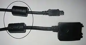 Le ferrite est une céramique ferromagnétique[1] obtenue par moulage à forte pression et à haute température (>1 000 °C) d'un mélange d'oxyde de fer(III) et d'un autre oxyde métallique, de formule Fe2O3XO (où X : manganèse, zinc, cobalt, nickel, plomb, baryum, strontium, etc.). Il est très utilisé en électronique et permet de mettre en œuvre des applications diverses et variées grâce à ses propriétés.