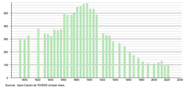 L'évolution du nombre d'habitants est connue à travers les recensements de la population effectués dans la commune depuis 1793. Pour les communes de moins de 10 000 habitants, une enquête de recensement portant sur toute la population est réalisée tous les cinq ans, les populations légales des années intermédiaires étant quant à elles estimées par interpolation ou extrapolation[18]. Pour la commune, le premier recensement exhaustif entrant dans le cadre du nouveau dispositif a été réalisé en 2006[19].