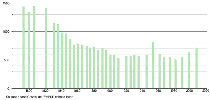 - Dans le tableau des recensements et le graphique, par convention dans Wikipédia, le principe a été retenu, pour les populations légales postérieures à 1999 de n’afficher dans le tableau des recensements et le graphique que les populations correspondant à l'année 2006, première population légale publiée calculée conformément aux concepts définis dans le décret no 2003-485 du 5 juin 2003, et les années correspondant à une enquête exhaustive de recensement pour les communes de moins de 10 000 habitants, ainsi que la dernière population légale publiée par l’Insee.