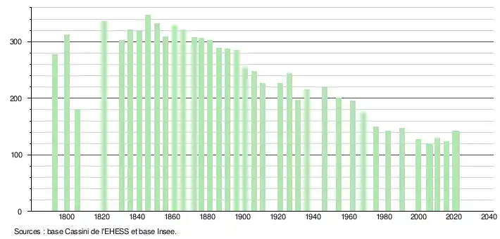 L'évolution du nombre d'habitants est connue à travers les recensements de la population effectués dans la commune depuis 1793. Pour les communes de moins de 10 000 habitants, une enquête de recensement portant sur toute la population est réalisée tous les cinq ans, les populations légales des années intermédiaires étant quant à elles estimées par interpolation ou extrapolation[19]. Pour la commune, le premier recensement exhaustif entrant dans le cadre du nouveau dispositif a été réalisé en 2005[20].