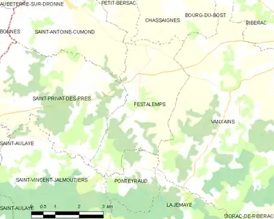 En 2016, année précédant la création de la commune nouvelle de Saint Privat en Périgord, Festalemps était limitrophe de sept autres communes dont Petit-Bersac au nord-ouest sur 550 mètres.