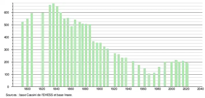 L'évolution du nombre d'habitants est connue à travers les recensements de la population effectués dans la commune depuis 1793. Pour les communes de moins de 10 000 habitants, une enquête de recensement portant sur toute la population est réalisée tous les cinq ans, les populations légales des années intermédiaires étant quant à elles estimées par interpolation ou extrapolation[25]. Pour la commune, le premier recensement exhaustif entrant dans le cadre du nouveau dispositif a été réalisé en 2005[26]. En 2021, la commune comptait 189 habitants[Note 4], en diminution de 9,13 % par rapport à 2015 (Aude : +2,47 %, France hors Mayotte : +1,84 %).