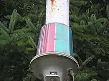 Le feu en question est de taille modeste (une vingtaine de centimètres de haut), mais le faisceau blanc a une portée nominale de 10 milles. On peut remarquer l'étroitesse du faisceau lumineux blanc au départ : c'est la partie non colorée du voyant entre le rouge et le vert.