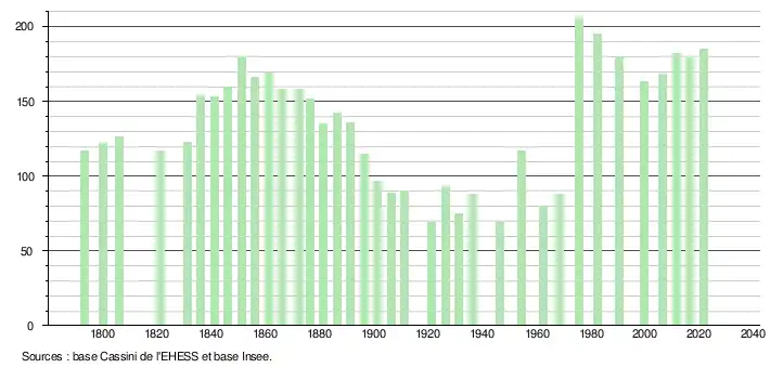 L'évolution du nombre d'habitants est connue à travers les recensements de la population effectués dans la commune depuis 1793. Pour les communes de moins de 10 000 habitants, une enquête de recensement portant sur toute la population est réalisée tous les cinq ans, les populations légales des années intermédiaires étant quant à elles estimées par interpolation ou extrapolation[17]. Pour la commune, le premier recensement exhaustif entrant dans le cadre du nouveau dispositif a été réalisé en 2006[18].