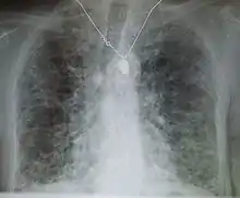 La radiographie du thorax peut être normale ou anormale, et le scanner thoracique montre fréquemment des anomalies caractéristiques[2].