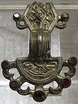 - Cruciforme. – Cette fibule appelée Zwiebelknopffibeln en allemand (fibule à tête d'oignon) se caractérise par un arc massif, un pied large et rectiligne et un système de charnière avec porte-ardillon en gaine. Le décor se compose de protubérances en forme d'oignon, parfois facetté aux extrémités des bras transversaux et de la tête. Elles ont une datation assez tardive. Les six types identifiés se succèdent chronologiquement des années 260 de notre ère aux environs de 400 de notre ère. Ces fibules appartenaient à la panoplie des militaires où elles servaient à attacher leur manteau, le paludamentum. On les retrouve donc quasi exclusivement en contexte militaire. Cela est également confirmé par l'iconographie : on en trouve une attachant le manteau militaire sur le diptyque de Stilicon du trésor de Monza ou encore sur le manteau du signifer Lepontius sur sa stèle conservée au musée de Strasbourg. Cette fonction militaire explique que l'on retrouve ces fibules dans l'ensemble de l'Empire jusqu'au Moyen-Orient et en Afrique.