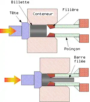 La billette (cylindre plein de métal) de métal préalablement chauffée est placée dans le conteneur. Un poinçon exerce une poussée. Le métal est d'abord plaqué contre la filière et file à travers elle en prenant sa forme définitive.