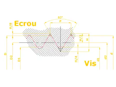 L'angle du filetage métrique étant de 60°, ce filetage a la forme d'un triangle équilatéral dont la profondeur H est fonction de la taille P du pas : H=√3P/2. Cependant, la valeur du diamètre intérieur d1 du boulon en fonction du diamètre nominal D et du pas P n'est pas exactement d1=D−2H, du fait de l'arrondi du filetage (valeurs H/8 et H/4 sur le schéma ci-dessous). On arrive ainsi à une valeur plus précise d1=D−2x(5H/8)=D-2x(5√3P/2)/8=D-5√3P/8, soit d1=D-1,0825×P. Pour être rigoureux, il s'agit d'une valeur approchée par excès de d1, puisque que le fond de filet du boulon est arrondi et non plat (la valeur H/4 utilisée dans ces calculs est un peu trop grande pour aller au fond du filet).