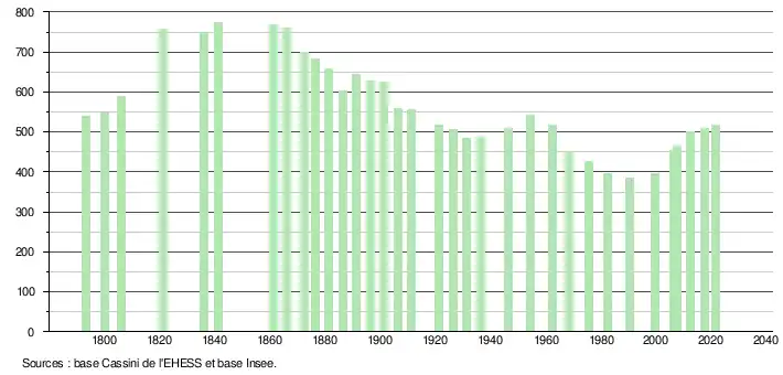 L'évolution du nombre d'habitants est connue à travers les recensements de la population effectués dans la commune depuis 1793. Pour les communes de moins de 10 000 habitants, une enquête de recensement portant sur toute la population est réalisée tous les cinq ans, les populations légales des années intermédiaires étant quant à elles estimées par interpolation ou extrapolation[21]. Pour la commune, le premier recensement exhaustif entrant dans le cadre du nouveau dispositif a été réalisé en 2007[22].