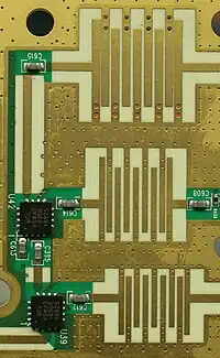 ![]() Le circuit imprimé à l'intérieur d'un analyseur de spectre Agilent N9344C de 20 GHz montrant divers éléments de la technologie des filtres à éléments distribués en microruban. |