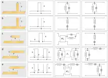 Les lignes couplées (figures 3(c-e)) peuvent également être utilisées comme éléments de filtrage ; comme les stubs, elles peuvent agir comme des résonateurs et, de même, être terminées en court-circuit ou en circuit ouvert. Les lignes couplées ont tendance à être préférées dans les technologies planaires, où elles sont faciles à mettre en œuvre, alors que les stubs ont tendance à être préférés ailleurs. La mise en œuvre d'un véritable circuit ouvert dans la technologie planaire n'est pas possible en raison de l'effet diélectrique du substrat qui fera toujours en sorte que le circuit équivalent contienne une capacité de dérivation. Malgré cela, les circuits ouverts sont souvent utilisés dans les formats planaires de préférence aux circuits courts car ils sont plus faciles à mettre en œuvre. De nombreux types d'éléments peuvent être classés comme des lignes couplées et une sélection des plus courants est présentée dans les figures[41].