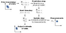 Le filtre de Kalman est composé de deux phases distinctes : la prédiction et la mise à jour. La phase de prédiction utilise l'état estimé de l'instant précédent pour produire une estimation de l'état courant. Dans l'étape de mise à jour, les observations de l'instant courant sont utilisées pour corriger l'état prédit dans le but d'obtenir une estimation plus précise.