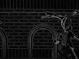 ![]() Gradient avec le filtre de Prewitt d'une image en nuances de gris d'un mur de briques et d'un râtelier à vélo |