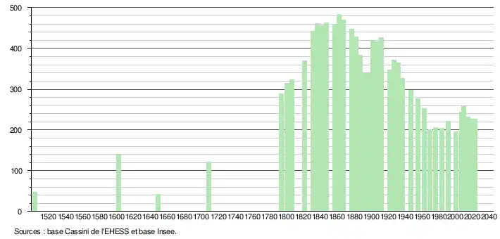 L'évolution du nombre d'habitants est connue à travers les recensements de la population effectués dans la commune depuis 1503. Pour les communes de moins de 10 000 habitants, une enquête de recensement portant sur toute la population est réalisée tous les cinq ans, les populations légales des années intermédiaires étant quant à elles estimées par interpolation ou extrapolation[19]. Pour la commune, le premier recensement exhaustif entrant dans le cadre du nouveau dispositif a été réalisé en 2008[20].