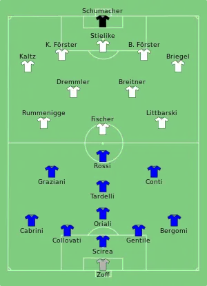 Éprouvée par une demi-finale allée jusqu'au bout de la prolongation et des tirs au but sous la chaleur de Séville, l'équipe allemande aborde la finale plus émoussée que celle d'Italie. Après une première mi-temps sans but au cours de laquelle Antonio Cabrini manque un penalty, les Italiens, plus frais, font la différence en deuxième mi-temps. Paolo Rossi marque ainsi le premier but du match à la 56e minute, puis Marco Tardelli aggrave le score en tirant à la limite de la surface de réparation avant qu'Alessandro Altobelli ne conclue une contre-attaque de l'ailier Bruno Conti, pour le but du 3-0. Breitner réduit la marque pour l'Allemagne à la 83e minute mais l'Italie tient le match pour finalement remporter son premier titre mondial depuis 44 ans, le troisième au total, avec une victoire 3-1.