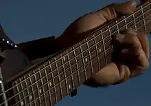 - la mélodie avec l'index, le majeur et l'annulaire, l'auriculaire restant la plupart du temps posé sur la table de la guitare.