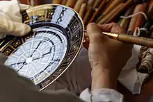 Atelier du brunissage de la manufacture nationale de Sèvres. Brunissage du filet de bord, assiette Uni, décor Charlemagne.
