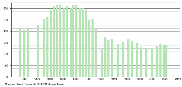 L'évolution du nombre d'habitants est connue à travers les recensements de la population effectués dans la commune depuis 1793. Pour les communes de moins de 10 000 habitants, une enquête de recensement portant sur toute la population est réalisée tous les cinq ans, les populations légales des années intermédiaires étant quant à elles estimées par interpolation ou extrapolation[19]. Pour la commune, le premier recensement exhaustif entrant dans le cadre du nouveau dispositif a été réalisé en 2007[20].