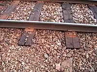 Sur les traverses en bois, il s'agit toujours d'une attache indirecte. La pièce métallique appuyant sur le patin du rail est maintenue sous pression par un ressort à spires boulonné.
