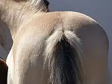 Quelques Fjords, plus rares, expriment le gène Crème, qui en agissant avec le gène Dun, est à l'origine des robes les plus claires chez la race[51]. Les Fjords possèdent aussi les traits du pangaré, comme le prouvent la décoloration du bout de nez, du ventre, de l'intérieur des jambes et du contour des yeux[47].