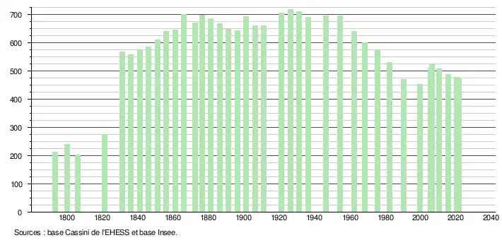 L'évolution du nombre d'habitants est connue à travers les recensements de la population effectués dans la commune depuis 1793. Pour les communes de moins de 10 000 habitants, une enquête de recensement portant sur toute la population est réalisée tous les cinq ans, les populations légales des années intermédiaires étant quant à elles estimées par interpolation ou extrapolation[40]. Pour la commune, le premier recensement exhaustif entrant dans le cadre du nouveau dispositif a été réalisé en 2005[41].