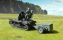 Une fois la tourelle, une partie du blindage de proue et la plage-moteur ôtées, une pièce monotube de 2 cm est installée avec son bouclier. Pour que le pilote puisse accéder au poste de conduite, l'arme est légèrement décalée sur la droite, mais l'ergonomie ne sera pas le point fort du petit blindé. Afin de gagner de la place, le blindage frontal est avancé de 18 cm, et des panneaux métalliques rabattables sont installés sur les côtés de façon à créer une plateforme pour les cinq servants.