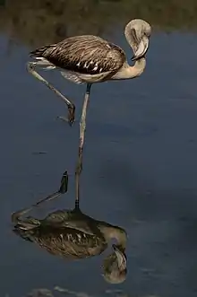 Flamant rose juvénile, dans la réserve naturelle de Gadhira, Malte. Septembre 2017.