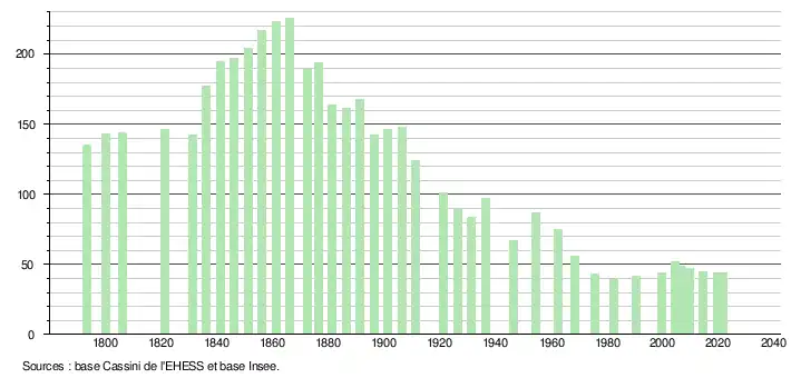 L'évolution du nombre d'habitants est connue à travers les recensements de la population effectués dans la commune depuis 1793. Pour les communes de moins de 10 000 habitants, une enquête de recensement portant sur toute la population est réalisée tous les cinq ans, les populations légales des années intermédiaires étant quant à elles estimées par interpolation ou extrapolation[17]. Pour la commune, le premier recensement exhaustif entrant dans le cadre du nouveau dispositif a été réalisé en 2004[18].