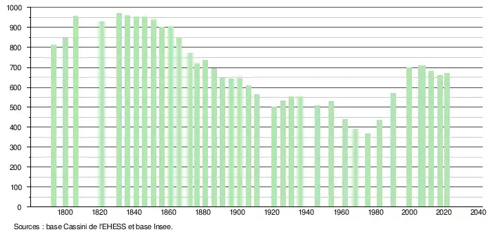L'évolution du nombre d'habitants est connue à travers les recensements de la population effectués dans la commune depuis 1793. Pour les communes de moins de 10 000 habitants, une enquête de recensement portant sur toute la population est réalisée tous les cinq ans, les populations légales des années intermédiaires étant quant à elles estimées par interpolation ou extrapolation[25]. Pour la commune, le premier recensement exhaustif entrant dans le cadre du nouveau dispositif a été réalisé en 2007[26].