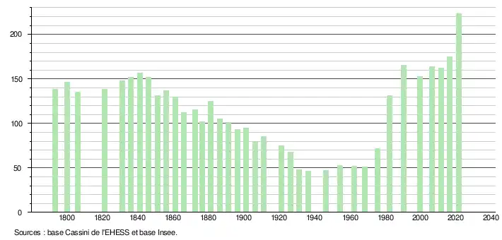L'évolution du nombre d'habitants est connue à travers les recensements de la population effectués dans la commune depuis 1793. Pour les communes de moins de 10 000 habitants, une enquête de recensement portant sur toute la population est réalisée tous les cinq ans, les populations légales des années intermédiaires étant quant à elles estimées par interpolation ou extrapolation[13]. Pour la commune, le premier recensement exhaustif entrant dans le cadre du nouveau dispositif a été réalisé en 2006[14].