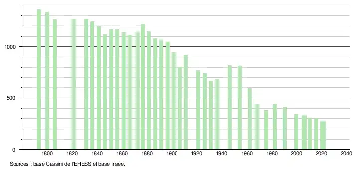 L'évolution du nombre d'habitants est connue à travers les recensements de la population effectués dans la commune depuis 1793. Pour les communes de moins de 10 000 habitants, une enquête de recensement portant sur toute la population est réalisée tous les cinq ans, les populations légales des années intermédiaires étant quant à elles estimées par interpolation ou extrapolation[23]. Pour la commune, le premier recensement exhaustif entrant dans le cadre du nouveau dispositif a été réalisé en 2005[24].