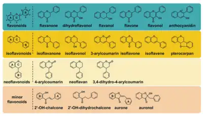 La distinction des sous-classes se fait en fonction de la conformation de cette structure centrale C. On peut distinguer notamment parmi les flavonoïdes[1],[15] :